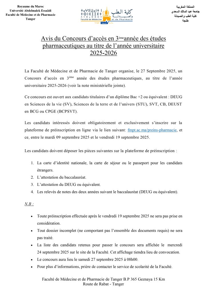 Avis du Concours d’accès en 3ème année des études pharmaceutiques au titre de l’année universitaire 2025-2026 Note Ministérielle : (Cliquez ici) Lien d’inscription : (Cliquez ici)
